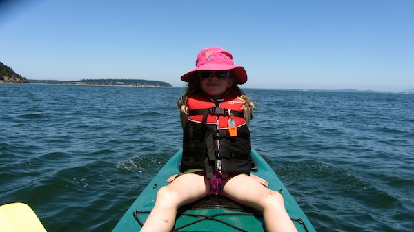 Heading home it was so calm (and “The V” is so comfortable in a boat) that she chose to sit on top of the middle hatch and just hang out so we could talk and sing songs as I paddled us home. This photo is looking north to Portage Island off the port bow. We changed our course to the east and headed for the north tip of Eliza Island and Larrabee on shore.